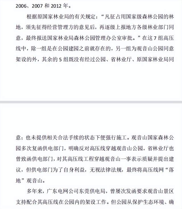 自2002年开始,南方电网旗下广东电网公司东莞市供电局在未经观音山方同意,审批手续不齐全的情况下(未向公园方提供国家林业、国土资源等部门关于同意在公园内架设高压线塔的批复文件),就先后毁林施工,将多组高压线塔强行架设在观音山国家级森林公园内,从而大面积破坏公园核心地段的林地及影响了公园整体形象。同时,这些高压线塔均穿行架设在公园主要游客通道上空,且未按要求升高架设。景区路基较高处,高压线距离地面仅为4米多,打雷下雨天,极其容易发生山火等安全事故,危险异常。