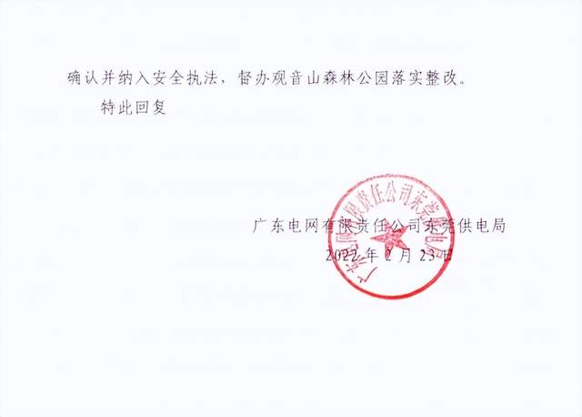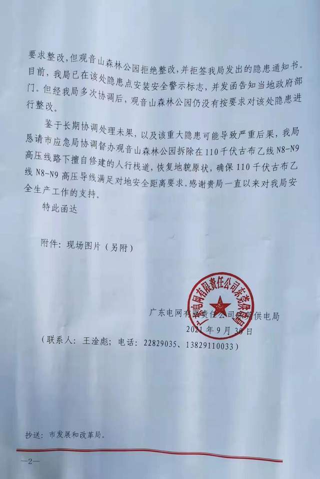 本来,东莞市供电局应该是一个为百姓为企业“发光”的国企单位,这次却完全一条道走到黑,再一次展开了疯狂报复。2021年9月28——10月11日,供电部门连续十几天里,向当地政府、安委、应急近10个部门发函称:因观音山擅自修建人行栈道,致使高压线不满足安全距离,导致已有人触电身亡和大规模停电。