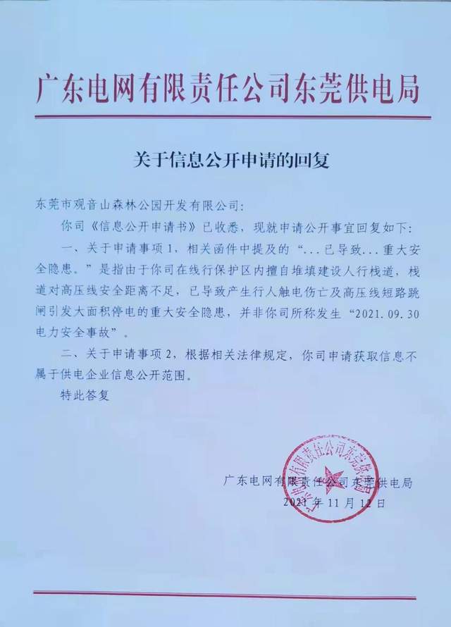 结果,东莞市供电局回函称:我说的是你观音山的原因,已致人触电伤亡的安全隐患。并不是真的有电力安全事故。