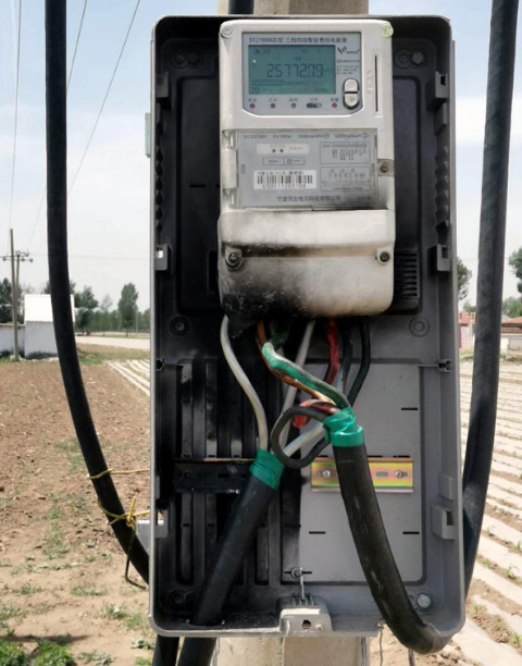 有些电线杆已经发生裂纹,在改造中仍没有更换。在马家圐圙,几个老人正在树下乘凉,当我们询问有关农网改造一事时,一位村民指着旁边一个电线杆说,“闹啥好嘛,这个电线杆都裂了也木有换”。我们仔细观察发现,村民指的这个电线杆还是老旧的水泥杆,杆体已经发生爆裂,裂缝很大,但在农网改造时却没有被更换。村民说,去年改造时就只换了线和电表。