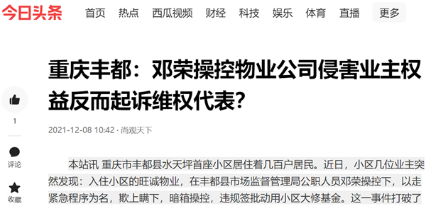 本站讯 重庆市丰都县水天坪首座小区居住着几百户居民。近日,小区几位业主突然发现:入住小区的旺诚物业,在丰都县市场监督管理局公职人员邓荣操控下,以走紧急程序为名,欺上瞒下,暗箱操控,违规签批动用小区大修基金。这一事件打破了小区的宁静。业主们得知消息后,个个义愤慎鹰,自发组织维权联盟,向有关部门提出抗议,坚决维护小区业主的合法权益。全体业主联名向各大新闻媒体及纪检、监察、信访等部门实名投诉控告,请求媒体和上级部门将旺诚物业实际控制人邓荣的违纪违法事实深入核查,向社会公众曝光。