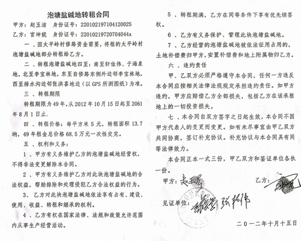 据介绍,农安县农安镇太平岭村以前周围是一片荒漠和沼泽,因为没有村路,全村村民想出村都很困难,得穿水靴趟沼泽泥泞地。如何解决当地农民的脱贫问题,曾经长期困扰着村镇干部。镇政府想解决问题却没有钱,经镇党委会研究决定,将村里泡塘盐碱地对外租赁50年,抵顶村里修路工程款。在此政策下,2012年10月以后,宫坤妮来到太平岭村,让村民们看到了一点希望。宫坤妮以前在长春做过多年的房地产,有一定的人脉和经济实力。2012 年10月15日,经农安镇政府同意,并通过村民代表大会决议,太平岭村与宫坤妮签订了《泡塘盐碱地承包合同》,此合同还在镇经管站备了案,该合同约定允许承包者对该土地进行建设、买卖、转让、继承,同时进行生产经营活动等。
