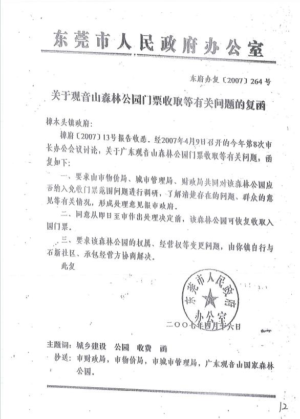 2006年12月6日,樟木头镇政府向观音山公园发出樟府函(2006)30号《关于观音山森林公园经营权调整有关问题的函》,提出:市政府已同意将观音山森林公园纳入银瓶嘴森林公园总体建设规划,工程建设资金由市镇两级按比例分担。为做好经营权调整工作,请观音山公司将相关资产、帐目清理清楚,备齐所有资料,交中介机构进行评估,待评估结果出来后再商讨股份、经营权、补偿等有关问题。