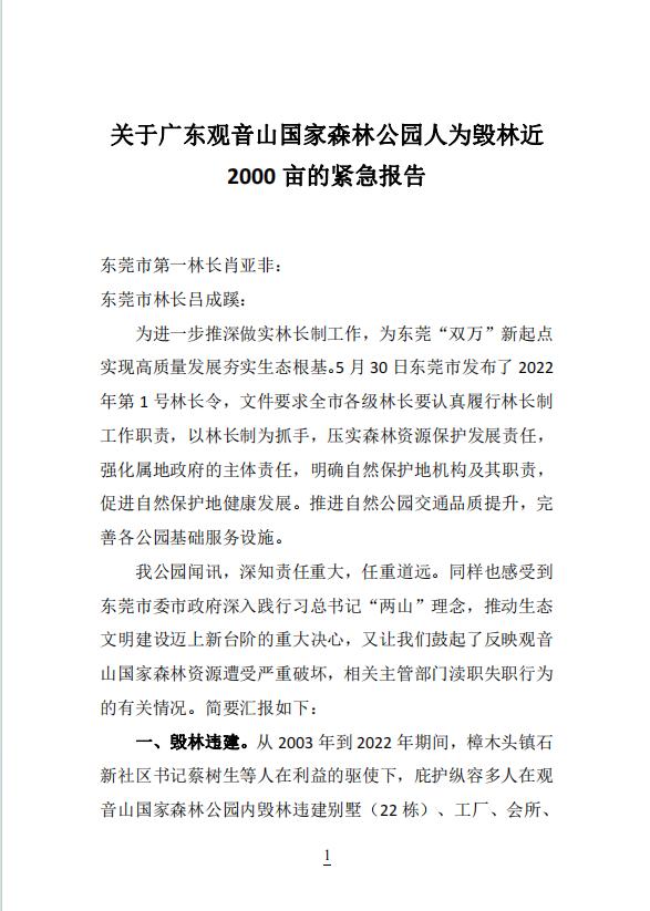 “按照国家相关森林法律规定,东莞市自然资源局、东莞市林业局负有对毁林违法行为进行依法查处的法定职责。”观音山景区的一位老员工表示,每次我们景区发现乱砍滥伐、违建现象后,都及时向东莞市自然资源局、东莞市林业局、樟木头林业站、樟木头农林水务局等进行反映,相关主管部门过来也只是走走过场,再无后续。比如,在2019年观音山景区以书面形式向东莞市自然资源局、东莞市林业局及有关部门反映情况,但都没有得到正面回应和处理。