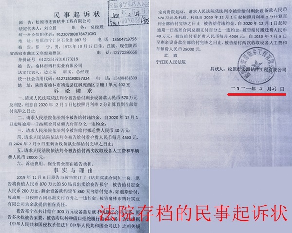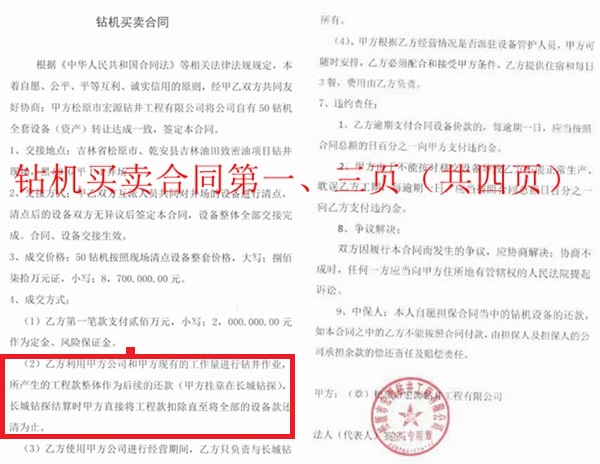 事情还得从2019年12月说起。陕西省榆林市博轩实业有限公司(以下简称博轩实业)负责人向记者介绍:2019年12月6日,松原市宏源钻井工程有限公司(以下简称宏源钻井)的法定代表人刘立国(又名刘立祥),称其在吉林油田有五口钻井的工作量,能挣大钱,并有一套钻机,不想经营了,想对外转让。博轩实业信以为真,就指派公司股东、实际控制人祁宁,与宏源钻井法定代表人刘立国签订了一份《钻机买卖合同》,按合同约定,50号钻机全套设备(资产)价格870万元,博轩实业先交200万元定金,余款用博轩实业挂靠宏源钻井现有的工作量进行钻井作业,所产生的工程款作为后续还款,直至将全部的设备款还清为止。