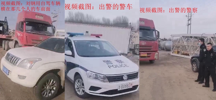 正在此时,刘钢刚好赶到现场,就用自驾的车辆横在那几个人的车前面。这时,那几个人居然给警察打了电话,警察让刘钢接听电话,说他是月亮泡派出所的民警,叫刘钢放行那几个人不得阻拦。刘钢则气愤的对警察说:”别人抢我们的东西,我能放他走吗?“警察则在电话里说:”你能不能听懂人话?你要是不放他们走,让我们过来的话,对你就不是现在这样子了!”刘钢则坚决的说:”我不知道你是不是警察”,就直接把手机还给那几个人并继续阻挡。