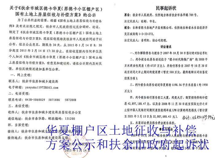 公开的政府文件等证据证明,华夏棚户区是2007年3月30日扶余市政府提交人大常委会通过定下的棚户区改造项目,扶余市住建局2007年6月21日发布棚户区拆迁公告,开始实施拆迁。扶余市政府于2015年1月14日再次发布了关于《扶余市城区德卡华夏(原德卡小区棚户区)国有土地上房屋与补偿方案》的公示。然而时至今日,仍然有10户没有完成拆迁,其主要原因是公检法官员家属带头当钉子户,其中,刘秉林是原扶余市公安局经侦大队队长刘春水的父亲,现在是扶余最大的地产商,苗月华则是原扶余市法院常务院长王安军的夫人。无奈之下,德卡公司向吉林省软环境办公室反映情况。省软办在长春组织召开了一次协调会,要求主要领导参加,大成律师事务所律师竟说代表政府参加协调会,当时被省软办领导赶了出去,此次协调会无始而终。2019年3月份,吉林省软环境办公室再次到松原协调此事,省软办和松原市、扶余市主要领导以及大成律师事务所刘颖律师参加了会议。经过省软办领导协调,扶余市政府承诺在2020年3月份前完成拆迁。令人感到十分不解的是,至今扶余市政府也没有完成拆迁,导致棚户区十五年没有拆迁,回迁户叫苦不迭。对于此事,央广新闻、法制与社会、北京时间、今日头条等诸多媒体曾多次跟踪报道,而扶余市政府依然我行我素,没有将其拆迁完成。作为扶余市政府的法律顾问,大成律师事务所明知政府是无理之诉,却为了获取200多万高额的律师费,竟鼓动政府将德卡公司诉至法院,诉讼费用高达87万元,请求解除双方于2007年10月30日签订的《协议书》,并要求德卡公司支付近1.7亿的补偿款。根据公开的政府文件等证据,德卡公司认为:拆迁是政府的法定责任。华夏区块棚改十五年不能回迁,从而导致企业与政府的置换协议未能履行的责任在于扶余市政府,是政府不能完成拆迁造成的,德卡公司并没有任何责任,政府不去履行法定责任,反而起诉德卡公司,这是典型的猪八戒摔耙子——倒打一耙,也是典型的虚假诉讼、无理之诉,其目的,就是想把回迁户不能回迁的责任推给企业。