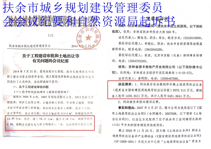 可是,德卡赢了官司却拿不到钱。就在政府败诉之后,扶余市自然资源局立即对德卡提起诉讼(案号【2021】吉07民初6号),手里拿着对建筑面积和容积率有着明确规定的2014年7月21日扶余市城乡规划建设管理委员会会议纪要(占地面积11151平方米,建筑面积12.29万平方米,容积率9.06),竟起诉德卡公司超容积率,欠土地出让金和滞纳金共计5400多万!