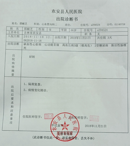 她还提供了农安县人民医院2018年11月2日至5日的住院病历和2018年11月18日因患有缺血性心脏病、陈旧性脑梗等严重疾病入住该院的诊断书,证明其认罪的当时是由于患有严重疾病,为了保命违心认罪。