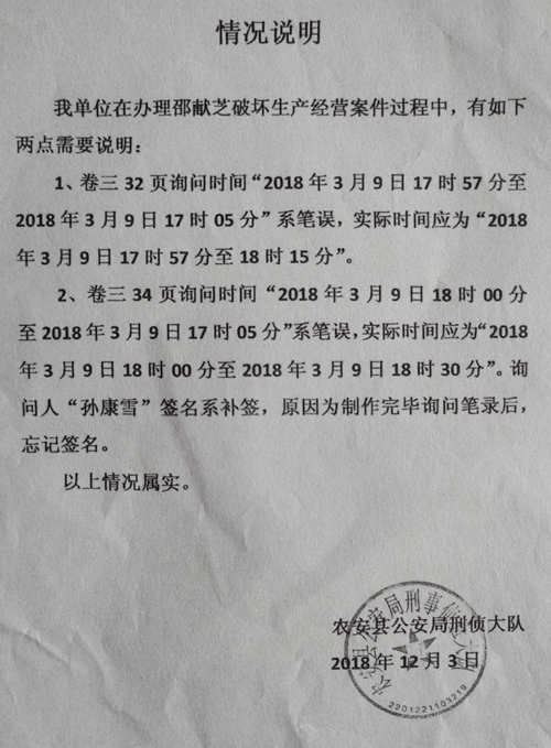 另外,该《情况说明》在形式上也不合法,由于该《情况说明》上面只有农安县公安局刑事侦查大队的公章而没有询问人员的签章,根据法律规定,不能作为证明取证合法性的证据。因此,上述证据应当被作为非法证据子以排除。