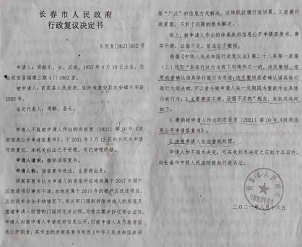 为了调查此次拆迁是否合法,邵献芝出狱后曾经向农安县政府申请信息公开,但农安县政府做出的农依复(2021)第9号《政府信息公开申请答复书》则称“相关信息不存在或者无法公开”。邵献芝不服,向长春市政府申请行政复议,长春市政府复议认定其主要事实不清,证据不足,决定撤销农依复(2021)第9号农依复(2021)10的《政府信息公开申请答复书》,责令被申请人依法重新处理,但是时至今日,农安县政府也没有重新处理。