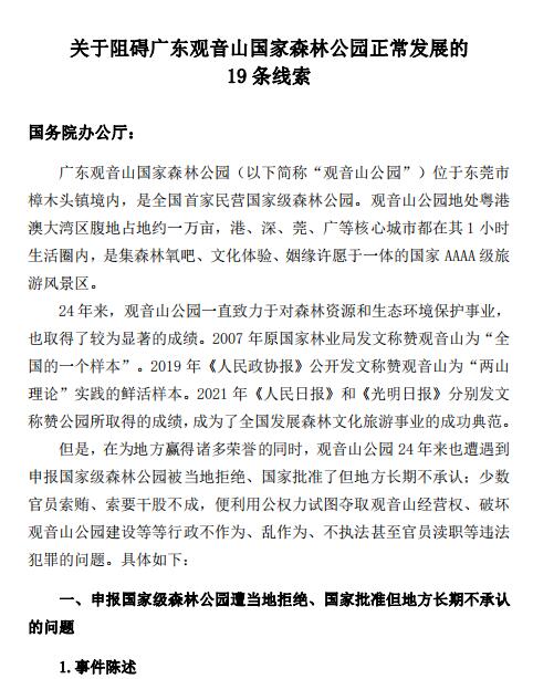 广东观音山国家森林公园向国务院反映阻碍正常发展的19 条线索