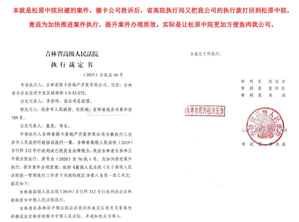 而吉林省高级法院执行局的做法更绝,在该院执行局局长李永秋的指使下,该院2023年8月29日竟然做出(2023)吉执监66号执行裁定书,将吉林省高级法院(2019)吉行终312号行政判决交由松原市中级法院执行,把德卡公司的2000多万提存款和案卷全部转给松原市中院。对此,德卡公司感到震惊:此案本身就是异地审理的案件,目的就是让松原中院回避,所以吉林省高院才指定由林区中院审理。现在,由于省高院执行局李永秋的干预,此案又被打回松原中院去了。德卡公司在林区中院的提存款处于查封期间,居然都能违规划走,高院执行局又把德卡公司剩余的2000多万元转回松原中院后,这些法官们干坏事就更加方便了,导致德卡公司为扶余市政府垫付的巨额工程款就更难要回来了。从此,我公司胜诉执行的提存款,就成了他们案板上的唐僧肉,可以由他们随意宰割了。
