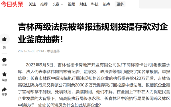 2023年9月5日,吉林省德卡房地产开发有限公司(以下简称德卡公司)老板姜永库、法人代表李彦伟向吉林省纪委、监察委、政法委等部门递交了实名举报信。举报信称:长春市林区中级法院执行局违规扣划该企业的执行提存款420万元后,吉林省高级法院执行局又将该公司剩余2000多万元提存款打回松原中级法院,致使该企业赢了官司却拿不到钱,处境艰危,濒临倒闭。他们不解,在全国上下都在大力促进民营企业发展的大背景下,省高院执行局长李永秋、长春林区中院执行局局长闫莉及林区中院执行一处处长何海凤为什么如此坑害企业?