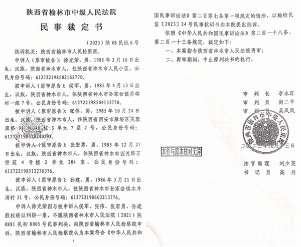 哪里有欺压,哪里就有反抗!徐光荣四处投诉、控告、检举无果,不得已申诉到榆林市人民检察院,案件终于迎来了转机,该院在接到徐光荣的《监督申请书后》,仔细调研了相关案情,提取证据,并于2023年10月30日出具榆检民监(2023)第24号《民事抗诉书》,认为:“2018年5月31日前徐光荣已经将抵债房屋过户给了张伟、侯军、张宏勇、孙建,本案也不属于《民法典》563条规定的当事人可以解除合同的情形。神木市人民法院2021陕0881民初8005号民事判决书认定事实错误,提出抗诉,依法再审”。本案将于2023年11月21日在神木市人民法院另行组庭重审,届时孰是孰非,或可水落石出,真正的还受害人一个公道!