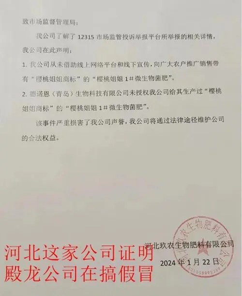 4,河北玖农生物肥料有限公司出具的证明,证明殿龙公司生产销售的樱桃姐姐1#微生物菌肥假冒其他厂家,是假冒产品;