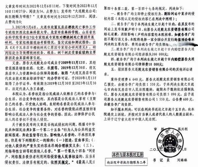 记者从李广军处看到了这份判决书后,不禁感到细思极控。判决书所称的名誉侵权稿子主要有:《大连瓦房店:樱桃树遭无声屠杀谁是凶手》、《大连瓦房店:“樱桃姐姐”温柔的残忍只顾赚钱?》、《大连殿龙公司:疯狂删稿为哪般?》、《大连瓦房店:樱桃事件考验公权力,是进是退?》。但是,这个判决书中并没有实质性的证据能够证明构成名誉侵权。其前面罗列的都是大连殿龙的一些业绩和做过的一些好事,而对于李转发稿子所依据的主要证据连提都没提。案涉文章的主要证据有:针对樱桃姐姐6#全能型涂干营养液的《分析报告》、鞍山绿洲林木果业技术鉴定有限公司出具的《技术鉴定意见书》和《信访事项处理意见书》等。