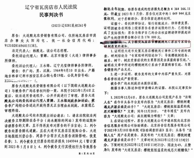 对此,李广军举出案涉文章依据的大量证据气愤的说:大连中院的裁定简直就是睁眼说瞎话,其认定案涉文章“没有专业性结论”、“缺乏事实依据”纯粹是胡说八道,是罔顾事实的枉法裁定。记者从案涉文章中看到,其陈述的事实有大量权威性的证据作为依据,有针对樱桃姐姐6#全能型涂干营养液的《分析报告》,鞍山绿洲林木果业技术鉴定有限公司出具的《技术鉴定意见书》和瓦房店市农业农村局出具的《信访事项处理意见书》等。这些权威机构均证明,大连殿龙的植保方案确有问题。其中,鞍山的《技术鉴定意见书》是迄今为止最具权威性的鉴定,该鉴定称:“纪小卫等栽植的樱桃树,栽培管理正常。樱桃树受害排除冻害、涝害、肥害、除草剂药害、杀虫杀螨剂药害、拉枝伤害、根系侵染性病害及土壤因素所致”;“受害樱桃树呈现出典型的铜离子药害症状,施用33%喹啉铜悬浮剂和23%松脂酸铜乳油是樱桃树受害的直接原因”;“所施用的33.5%喹啉铜悬浮剂和23%松脂酸铜乳油,均未在樱桃树上获得登记,属擅自扩大使用范围。”据悉,鞍山的《技术鉴定意见书》是迄今为止最具权威性的鉴定,至今没有任何机构做出更权威的鉴定意见能够否定,而大连中院的裁定硬是给案涉文章扣上了一个“没有专业性结论”、“缺乏事实依据”的大帽子,令人感到十分不解。这里要提请网友特别注意,这份裁定的审判长是刘如魁,审判员是董卫、胡俊杰。