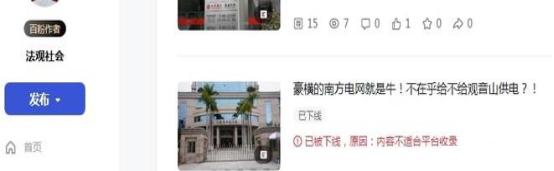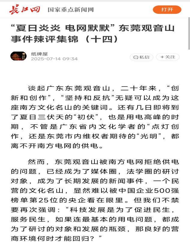 南方电网,删帖招数不断为哪般 孟振平董事长可知:南方电网删掉的是帖子,失去的却是人心 独立撰稿人 李海波 日前,撰稿人登录今日头条后台发现,发布的《不打压迫害,广东观音山年营收入可望超10亿元》被端呱咎恕6端呷巳词枪愣缤径腹┑缇郑� ![]() 东莞供电局的举报描述是:“从2014年起,观音山公司多次通过各类平台发布不实信息。其中,针对供电部门的不实舆情主要为公园供电受阻致26年来近80%区域依赖自发电、供电部门擅架线塔侵权,以及倒推涉电安全隐患责任等内容。事实上,自2003年起,东莞供电局便一直向公园提供供电服务。根据《供用电合同》将电力供应至公园的产权分界点。在高压线塔架设纠纷中,观音山公司三次诉讼均败诉,法院认定线路建设早于公四承包经营,未构成侵权。而涉电安全隐患是公园经营方擅自在1995年建成的110千伏线路下方修建栈道所致,东莞供电局已向公园发出整改通知,其拒绝签收且拒不整改,鉴于相关文章存在不良舆论导向,致使不实内容广泛扩散,已对我司企业形象造成影响,恳请及时删除、屏蔽相关链接。” 明明是写观音山的发展情况,怎么就牵涉南方电网了呢?