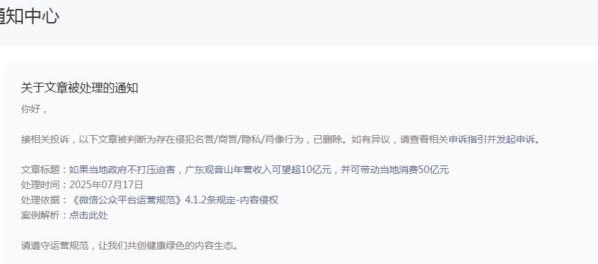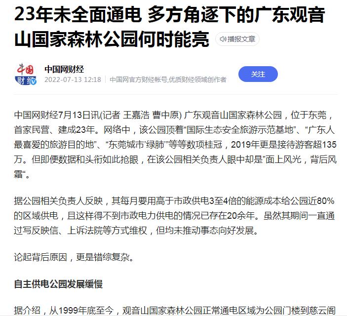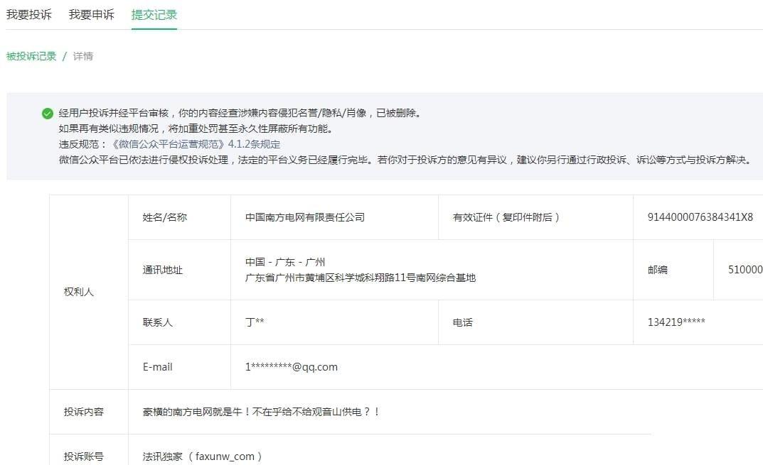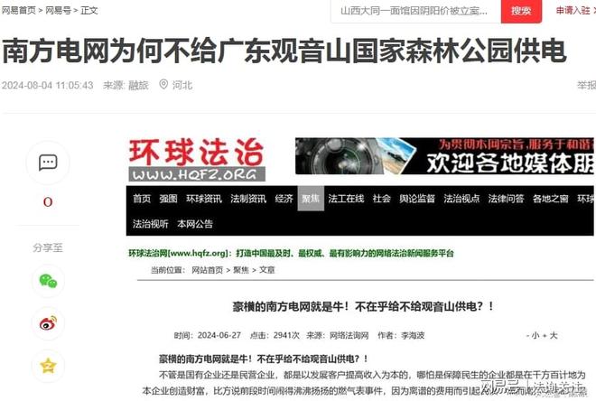 在19:53,微信公众号即发来通知,确认“你的内容经查涉嫌内容侵犯名誉/隐私/肖像,已被删除”。 微信公众号的动作之快,实属罕见!因为之前被投诉时,基本上都是5天左右才确定。这次删除文章,根本就不给作者提供申诉的时间。 不但如此,在国内备案的一些网站也收到了当地相关部门的通知,要求删除转载的该文章网页。 ![]() 有网站转发了该文,在6月28日中午收到了属地网信办的通知,告知是12377平台举报的,市级转交下来的,要求删除。 在6月28日15:52,某网站负责人接到了保定市某居委会的电话,说是转发的文章需要删除,上级部门联系不上才通知居委会的。![]() 网易号“法询独家”发布的《终于知道南方电网为什么不给观音山供电了!》在展现803次后没有通知,直接下线! ![]() 百家号也是直接下线,没有任何通知 ![]() 今日头条没有下线,但就是不能分享 想一想,南方电网作为副部级的央企,在南方有着独特的垄断地位,谁敢不服?!断你的电,你还不老实?!微信公众号属于腾讯的,腾讯不听话?断你一小时的电,你就难受要命,更别说像观音山公园那样的小民企,实行错峰供电,你能正常营业吗?一篇文章,删就删了呗! 我们看看网络上现在还存在这些南方电网和观音山问题的帖子吧:《公园要求用电可以吗?专家:不能拒绝供电》、《南方电网对东莞民企的伤害有多深?社会影响有多坏?反馈来了》、《东莞供电局 难道说瞎话就能推卸责任吗》、《豪横的南方电网就是牛!不在乎给不给观音山供电?!》、《南方电网,果然豪横无耻!》、《南方电网孟振平董事长:您知道拒绝给公园供电阻碍了民营企业的发展吗 》。![]() 除了这些撰稿人反映南方电网与观音山公园的供电纠纷外,网络搜索其内容多达数百篇:《观音山公司诉南方电网等侵权案在广东开庭》、《东莞维权有多难?供电部门22年不给民企观音山供电》、《东莞市电力部门长期拒绝给观音山国家森林公园供电何解》、《广东观音山国家森林公园依法申请用电 东莞供电局长期拒绝供电并企图推卸责任》、《“小香港”之称的繁荣地,存在未通市政电力之现象》、《广东观音山国家森林公园多年缺电频遭毁林的背后》、《首座民营国家级森林公园遇通电难题 欲借纾困潮破局》、《“电老虎”现形记:东莞国家级景区供电被卡脖子23年》、《自主供电23年 广东观音山国家森林公园何时全面通电》、《东莞民企艰难发展之路:在那些没电的日子里》、《国家森林公园遭遇“电老虎” 24年用电问题悬而未决》、《东莞民企给供电局送“锦旗”,希望解决公园80%服务区域用电》、《给国家森林公园供电 点亮东莞民企发展的希望》、《广东观音山如何从黑夜走向万家灯火》、《25年经营权争夺余波:观音山国家森林公园遭电力部门“卡脖》、《25年黑灯瞎火,东莞民企送锦旗只为能见“光明”》、《南方电网对东莞民企的伤害有多深?社会影响有多坏》、《南方电网为何不给广东观音山国家森林公园供电》、《东莞观音山致南方电网公司及其董事长孟振平先生公开信》、《权威专家说法:谁来管一管南方电网东莞供电公司》、《东莞观音山指南方电网董事长阻碍其发展》、《南方电网为何不给广东观音山国家森林公园供电》、《专家说法:北京专家研讨广东观音山被南方电网拒供电》、《电网线塔建在国家级森林公园里,破坏森林隐患大》、《4A景区25年没有正常供电 竟发生在今天的东莞》、《国家森林公园遭遇“电老虎” 24年用电问题悬而未决》、《讽刺漫画《电霸作恶》直指电力老虎对待观音山二十载奇事(二十)》、《名家评论第七期:北京专家研讨广东观音山国家森林公园被南方电网拒绝供电事件(四)》、《“观音山上观山水 供电局旁无电供”观音山事件辣评》、《“夏日炎炎 电网默默” 东莞观音山事件辣评集锦(十四)》...... 对此,公园董事长黄淦波先生及广大的读者们就不解了:一个副部级的垄断型央企,违法违纪恶招二十五年不断,其上级居然能不管不问?!在中国的99个央企中,南方电网算是超级另类吧? 在4月29日发布的《国家森林公园遭遇“电老虎” 24年用电问题悬而未决》文末撰稿人如此问南方电网孟振平董事长:长期在电力系统任职的孟振平董事长能有所作为吗?!还会继续派人来删文章吗?南方电网还是央企吗?答案是显而易见的:孟振平董事长不听民声,再是一味地实行删文章来掩耳盗铃! 孟振平董事长可知“文章千古好,仕途一时荣!”保不齐那一天,您会不会因为某件事而遗臭万年呢,毕竟,作为从事国民经济的基础产业和国计民生的公用事业的央企一把手,您在其位任由丑事不断而不谋其政,谁知道你在干嘛呢?!自己真的干净吗?南方电网有限责任公司原党组成员、纪检监察组组长龙飞还不是因为受贿被判刑7年呢! 另外,据说删贴是要花大价钱的,不断的删贴,更是要花不少钱,央企的南方电网财务能报销吗?入哪个科目?如不能报销,钱由谁出?如果是做南方电网工程的公司出?这里面有多少道道?相信孟董事长比我们更清楚吧?请能干的孟董事长出来走几步? 删帖删的是一时帖子,但删不掉一世骂名!宗老生前一直宣称只有一个女儿,在去世后几年就曝出了7个子女争家产的事件呢!家族遗产纠纷发酵引起了销量下滑。所以,人,不能心存侥幸,总有一天,会大白天下。南方电网的孟董事长啊你须知:“人在做,