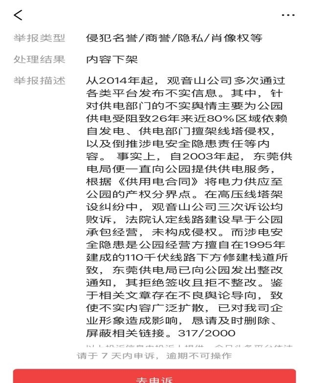 于是撰稿人仔细查看了这篇1万余字的文章,发现了又这么100字提及了南方电网问题“特别是南方电网属下的东莞市供电局拒绝给公园供电:2020年12月22日央视《谈事说理》栏目播出专题“《谈事说理》之搁浅的公园”其中就着重谈到观音山国家森林公园悬而未决的基本供电问题,之后全网和知名专家为之呼吁至今仍未解决。”同时配了一幅网文截图。 ![]() 微信公众号的该文也被下架 ![]() 值得疑惑的是,微信公众号“被投诉记录”里却没有相关信息 如此小题大做的投诉删帖,看来是南方电网又来当东莞当地的打手,来混淆视听吧?! ![]() 明知道申诉没有结果,但法讯君还是按照程序在17日的17:58提起了申诉。自己的权利,总归还是要争取的,至于今日头条这些平台只为自己利益着想,那就随他吧! 在当天晚上23:23,今日头条对撰稿人的申诉有了答复:亲爱的创作者,你提交的「不侵权声明」单号6115714不符合法定要求,原因:你的申诉理由不充分。如你认为被投诉文章不存在侵权,请具体明确指出,并针对投诉理由作出回应、提交对应证明材料。若需要补充举证,请在收到通知次日起7天内点击提交「不侵权声明」。 ![]() 今日头条后台,某创作者也是这样被通知下架的。 ![]() 除了撰稿人的帖子被南方电网东莞市供电局删除外,也有其他媒体人的今日头条帖子《“夏日炎炎电网默默”东莞观音山事件辣评集锦(十四)》被同样理由删除。 看看东莞供电局的删帖理由,挺奇葩的吧!申请理由严重不实! 一是“从2014年起,观音山公司多次通过各类平台发布不实信息,其中,针对供电部门的不实舆情主要为公园供电受阻致26年来近80%区域依赖自发电、供电部门擅架线塔侵权,以及倒推涉电安全隐患责任等内容。”,纵观观音山事件,发布的网络平台包括媒体,有中央电视台、人民日报、人民网、光明日报、经济参考报等中央媒体呢!他们发布的是不实信息?!![]() 公园自主发电机房,年支出是市政供电的3、4倍! 二是“自2003年起,东莞供电局便一直向公园提供供电服务”,但观音山公园没有说供电局没有完全供电,而是在公园区域有80%没有供电,26年来向东莞供电局申请全员供电而被推诿拒绝吗?还有在2021年7月18日,根据樟木头镇委书记指示,樟木头镇供电局刘书记、经发局领导和观音山公园再次召开用电协调会,经发局作为牵头让用电服务中心跟观音山对接,具体落实解决。会上经发局领导直接打断管委会主任汇报说的珠海因为无电引起安全事故省长都去现场的话,直接问需要多少电,上哪里?陈主任答复第一步就是山顶供电如果有一定困难,可以先把会展供上电;第二点是解决餐厅、沿途路上的照明,还有办公室、庙里。其实观音山和庙里是两个单位。在经发局领导中途离场后,双方又对高压线问题进行沟通,最终刘书记答复暂时解决不了而离开……会议纪要显示的该情节,如果不是拒绝供电,刘书记会参会吗?! 三是“根据《供用电合同》将电力供应至公园的产权分界点。在高压线塔架设纠纷中,观音山公司三次诉讼均败诉,法院认定线路建设早于公司承包经营,未构成侵权。”就此案件,多位法学专家认为:案涉四条高压线路的真实初始修建时间和是否为观音山公司承包前就已存续存在一定争议,一审、二审法院直接认定属观音山公司承包前已存续或变更升级改造而来是否得当?为何观音山均败诉?法院认为这些高压线并未架设在公园的红线范围内,故供电部门没错。而公园提供给法院证明高压线确实架设在公园范围内的证据文件《观音山国家森林公园总体规划》以及各工程施工的时间等均未被法院认可。出现这种结局,如果说此案没有行政力量干预司法,鬼都不信!而南方电网正是通过干预司法这种违法行为,为自己继续违法再次打脸了社会和法治。笔者倒是要请求广大游客,您们到观音山公园旅游时,看看那几十座高压线铁塔是不是在公园内的森林里,多照些照片发到朋友圈,让全社会都看一看,南方电网和东莞的某些法官是如何的颠倒黑白狼狈为奸,如此的睁眼说瞎话进行判案,这笔账今后一定要算的,毕竟太扯了。