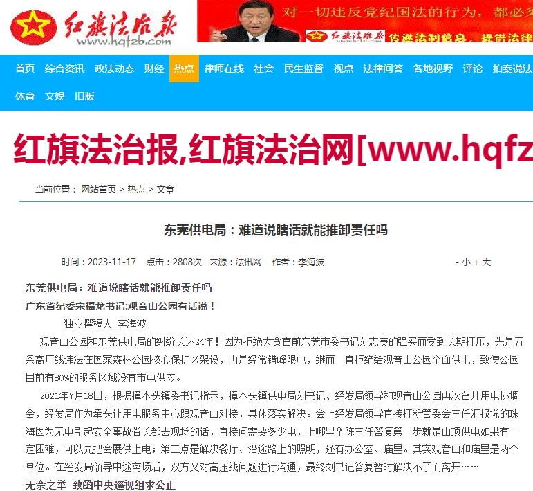 ![]() 安全隐患是南方电网非法架设的高压线塔,看看,危险不?! ![]() 国务院新闻办主办的网站发布的这也是不实信息吗? 其实,东莞供电局胡言乱语不是一时失误,而是有先河的。 2023年5月19日,广东观音山公园向中央巡视组提交了题为《南方电网对东莞民企的伤害有多深?社会影响有多坏?》的情况反映材料。之后东莞供电局进行了不实回复,观音山公园于11月1日给广东省纪委递交了书面材料《关于东莞供电局2023年10月7日不实回复及推卸责任的情况反映》,指明:1.东莞供电局拒绝给观音山供电的理由是观音山不是产权单位及以违章建筑为由不予办理增容和供电的情况回复是不实回复。东莞供电局的这一理由是不能成立的。2009年5月11日,观音山公司与东莞樟木头供电局公司签订供电合同。供电合同第1.1条约定用电地是“樟木头石新社区观音山森林公园”,用电性质:永久性。用电地域范围是“樟木头石新社区观音山森林公园”。合同约定的供电范围是“观音山森林公园“按照此合合同约定东莞供电局必须为整个观音山森林公园供电。但观音山森林公园至今仍有80%的区域没有供电。观音山十多年以来多次向供电局申请供电,东莞供电局却以产权为由拒绝供电。2.东莞供电局对观音山旁边的一百多座村民违章建筑供电,但对观音山森林公园内80%的区域却不予供电。两种不同的做法,有失公允。3.关于东莞供电局对观音山的增容、观音寺等新装业务不予通电的情况回复与事实不符:观音山目前可用电总功率为630千瓦,分别由两台变压器供电,两台变压器目前均能正常使用,但是在办理新装变压器增容的过程中,东莞供电局却拒绝办理,其理由是: 1.观音山不是产权人,办理用电需报社区的同意并盖章。2、会展中心(报装区城)属于违章建筑,经政府的两遗办同意并盖章后,由樟木头人民政府办理申报。供电局的这两个理由已经违反了《民法典》第648条、《电力法》第26条的规定。所谓“违建”只是东莞供电部门为了不给观音山森林公园通电的一个说辞面已。其目的是为了隐瞒事实,欺骗上级主管部门和社会公众。![]() 以上具体内容详见网文《东莞供电局:难道说瞎话就能推卸责任吗?》。 为什么南方电网如此不严谨的信口开河,估计是他们的心思不在认真对待问题上,认为发一份函件应付一下就可以达到目的而已!是不是其心思在如何收钱入职、贪污受贿等方面呢?毕竟,南方电网被曝的腐败问题可不少啊! ![]() 就连这个假的东莞供电局长尹文胜就能受贿1800万元!2017年12月25日,广东电网有责限任公司东莞供电局局长、党委副书记雷烈因犯受贿罪被判处有期徒刑十年六个月。 ![]() 看看,行贿30万入职南方电网的供电局引起了轩然大波了 ![]() 南方电网的腐败非比一般,丑闻不断 ![]() 但是,网络是有记忆的,也不是所有网站都能仍由其胡作非为。看看,该文章还有吧!能删除所有的吗? 网上显示南方电网近十年每年的固定资产投资都要达到近二千亿元人民币,想必大数额的投资都要经过孟董事长批准吧? 丑闻不断的南方电网,今后会不会再炸出几个惊天大雷?大家心里早有思想准备,按照这帮人的德性,真没人敢包它干净廉洁。![]() 网易还有贴文:《豪横南方电网就是牛!不在乎给不给观音山供电?!》 ![]() 看看,中国电力网转载的人民网文章《人民直击丨广东观音山:违建、缺电背后的森林公园争夺战》,南方电网,你能删除所有的声音吗?! 其实,南方电网除了这次无理申请删帖外,之前也有过其他手段删帖。 2024年6月27日发布了《豪横南方电网就是牛!不在乎给不给观音山供电?!》文章指出了南方电网的牛、豪、横、羞、耻。 ![]() 该文发出后的当天下午5时许,有自称是南方电网宣传部门人员,加法讯君为好友,欲咨询相关信息。但之后一直没有对话了。 ![]() 在18:30,法讯独家收到了腾讯的侵权投诉,称是“内容侵犯名誉/商誉/隐私/肖像”,并表示“侵权投诉审核中,平台会在7个工作日内审核处理,你可以在审核结束前作出本次投诉确认。主动确认侵权可减轻处罚。”