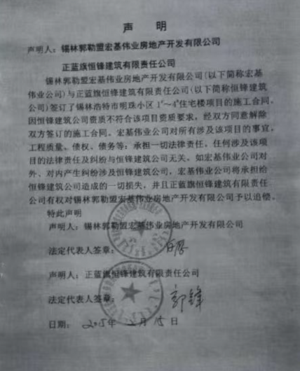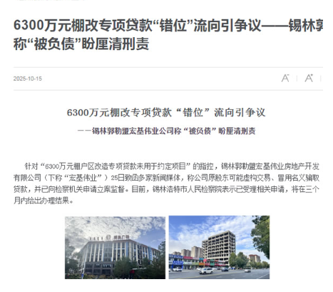 针对“6300万元棚户区改造专项贷款未用于约定项目”的指控,锡林郭勒盟宏基伟业房地产开发有限公司(下称“宏基伟业”)25日致函多家新闻媒体,称公司原股东可能虚构交易、冒用名义骗取贷款,并已向检察机关申请立案监督。目前,锡林浩特市人民检察院表示已受理相关申请,将在三个月内给出办理结果。