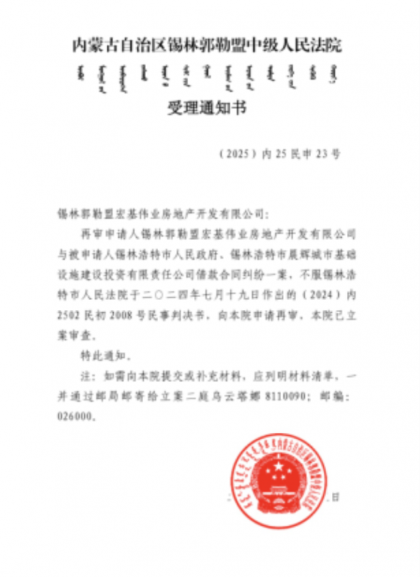 内蒙古自治区锡林郭勒盟中级人民法院日前下达《受理通知书》(〔2025〕内25民申23号),正式立案审查锡林郭勒盟宏基伟业房地产开发有限公司针对锡林浩特市人民政府、锡林浩特市晨辉城市基础设施建设投资有限责任公司借款合同纠纷一案提出的再审申请。该案一审判决(〔2024〕内2502民初2008号)由锡林浩特市人民法院于2024年7月19日作出,宏基伟业公司不服判决结果,依法向盟中院提请再审。