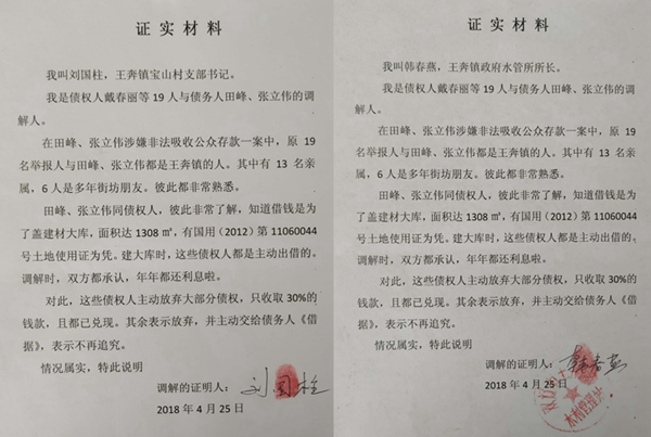 见到记者时,张立伟说:我们是从1993年的3月1日开始做建材商店这个生意的,因为货多没地方放,在2009年盖了一个大库房,因为盖房用了很多钱所以资金短缺,在2010年就从亲属借钱进货用。这些亲属相信我们为人,都愿意借给我们。我们一共从亲友手中借了94.15万,在2010至2016年间给他们利息共52.9万,判定书说100800元是不对的,是他们编造的。另外,还有两名亲属在法院起诉是民间借贷,借据在法院那边。公安抓我们时,我们在讯问笔录上已经说我们有货、办公房和库房,有能力偿还(我们借他们是94.15万元,还利息52.9万元元,还有收条和货物条7.36万元,经镇村干部调解还他们28.245万元)。