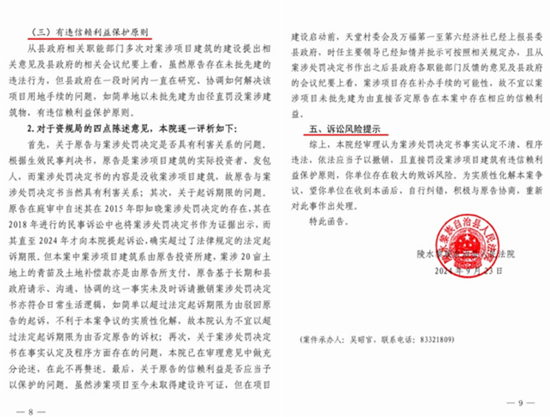 基于此,陵水法院郑重向政府相关部门发出警告:“本院经审理认为案涉处罚决定书事实认定不清、程序违法,依法应当予以撤销……你单位存在较大败诉风险。”法院苦口婆心地建议陵水县政府“自行纠错,积极与原告协商,重新对此事做出处理”。