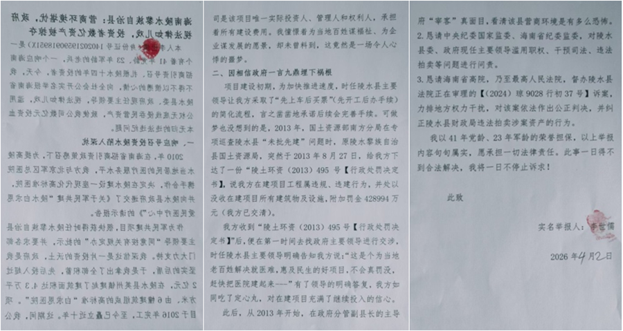 本人李世儒(身份证号14020219590918951X)是一个有着41年党龄、23年军龄的老兵,一个响应海南招商引资号召、扎根陵水十四年的投资者。今天,我不得不以愤懑的心情,向全社会公开实名举...