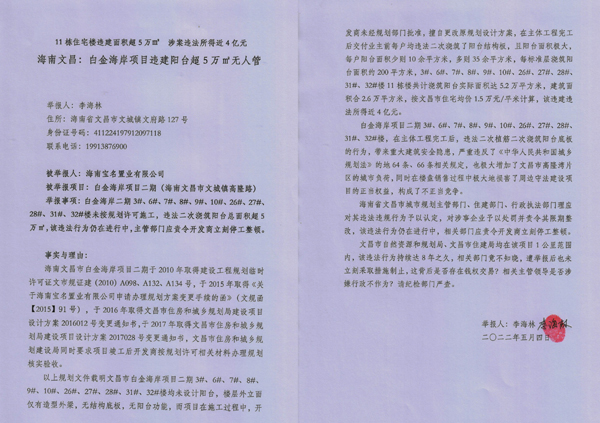 举报人称,海南文昌市白金海岸项目二期于2010年取得建设工程规划临时许可证文市规证建(2010)A098、A132、A134号,于2015年取得《关于海南宝名置业有限公司申请办理规划方案变更手续的函》(文规函[2015]91号),于2016年取得文昌市住房和城乡规划局建设项目设计方案2016012号变更通知书,于2017年取得文昌市住房和城乡规划局建设项目设计方案2017028号变更通知书,文昌市住房和城乡规划建设局同时要求项目竣工后开发商按规划许可相关材料办理规划核实验收。