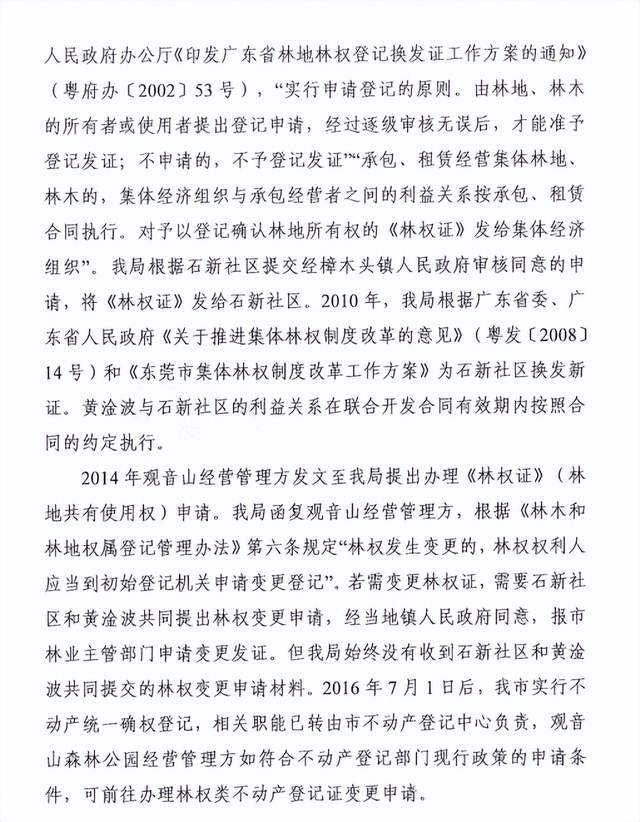 而在市林业局的信访答复书中称,樟木头镇石新社区2010年换发的10份林权证等级为公益林面积为3934.5亩,比2005年旧证登记为公益林的面积3209.7亩还多,不存在“借换证擅自改变为限额采伐的商品林范围内的荔枝经济林、用材林等其它树种林种的严重问题。”