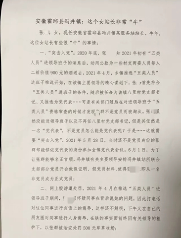 近日,来自安徽省霍邱县的群众反映,现任安徽省霍邱县冯井镇某服务站女站长张某。牛年,这位女站长有些很“牛”的事情。
