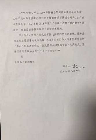 三、“吃空饷”。早在1999年张某分配到冯井镇计生办工作,工作不到一年在没有办理任何手续的情况下就擅自离岗,在六安市石油公司上班,直到2018年张某“在编不在岗”的问题被“效能办”查出后在全县通报这个笑话才算结束。