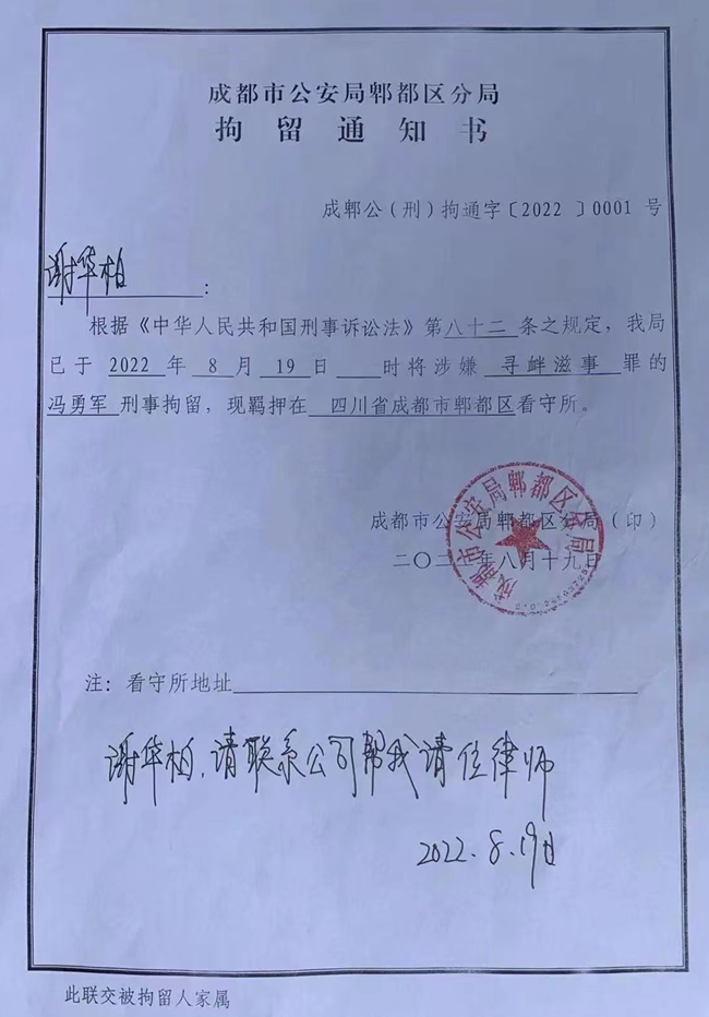 100后的今天,2022年8月19日,也是38岁的人民英雄锦旗哥冯勇军,为了中国共产党的政权长久,为了拥护习主席的英明领导,为了捍卫习主席号召的“依法治国”、“科技兴国”的战略方针,在成都市公安局郫都区分局,被逼在成郫公(刑)拘通字【2002】0001号拘留通知书上,冯勇军自己填写,自己签发,终于把自己拘留了。近100年来,不知牺牲了多少先烈才换来了习主席的盛世和平?!不知四川省高院王树江院长、郫都区公安局、郫都区检察院何时又把捍卫习主席“依法治国”的锦旗哥冯勇军送上绞刑架?!