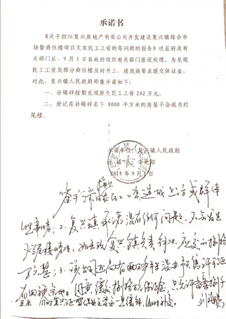 复兴镇政府在没有告知复兴公司及胥培升的情况下,就开始了一通“资本运作”,于2015年9月6日,将项目楼盘8000平方米的房屋备案登记到广宇公司代表孙锦祥的名下让其去融资,以解决当时的困境。同时高县政府、复兴镇政府、住建局及施工单位(广宇公司)还共同出具了一份《承诺书》,承诺这8000平方米的房屋不会成为烂尾楼。这8000平米的房屋并没有如愿为项目融资来资金,至今仍然登记在孙锦祥的名下。