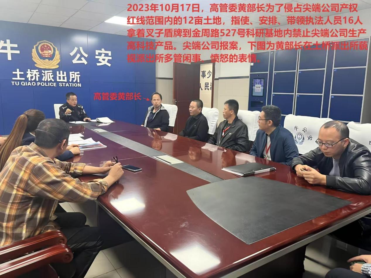 据王先生回忆,2023年10月17日,金牛高管委的这位黄部长为了侵占尖端公司产权红线范围内的12亩土地,指使、安排、带领执法人员16人拿着叉子盾牌到金周路527号科研基地内禁止尖端公司生产高科技产品。