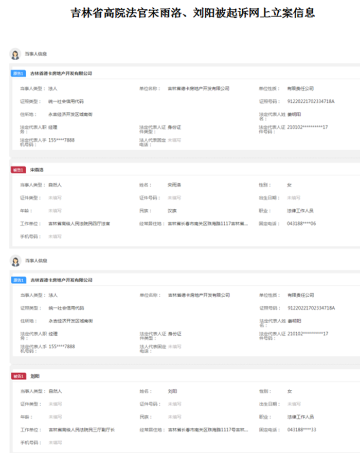 据德卡公司的民事起诉状载明,宋雨洛是吉林省高级法院民四庭法官,刘阳是该院民三庭法官、副庭长。起诉书称: