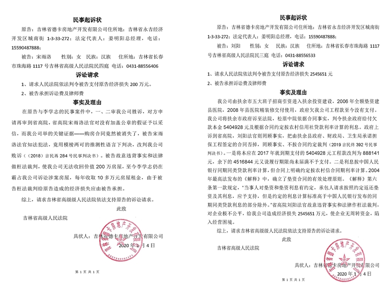 2021年1月4日,对吉林省司法界、企业界来说,或许注定是个极不平凡的日子。这一天,吉林省德卡房地产开发有限公司(简称德卡公司)在网上起诉吉林省高级人民法院宋雨洛、刘阳两名法官已经被正式立案受理!记者从网上搜索发现,在国内,企业起诉法官又被立案的案例目前尚未发现先例。德卡公司的这一举动或将开启国内司法界、企业界的先河,成为企业维权的一个标志性事件。
