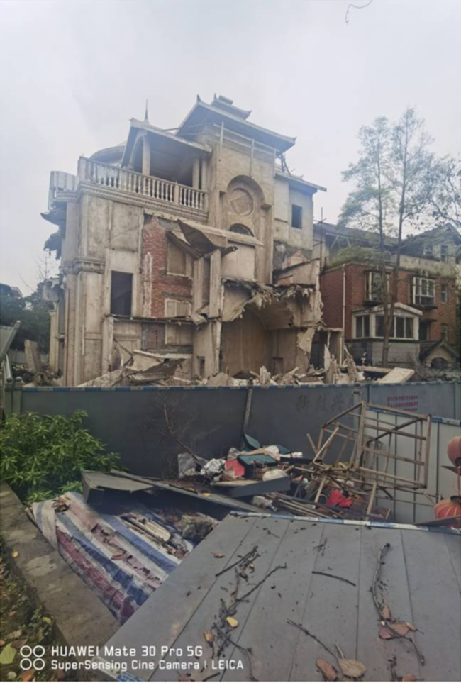 在君临天下小区,一共有401栋别墅,所谓违规搭建的有260多栋。成都方面2018年11月28日,选择性强毁掉这座科技展示楼,满目沧桑,有点像八国联军破坏圆明园相似。在如此美丽的小区中心位置,出现这么一个极不协调的东西,不知,破坏它的人会怎么想?