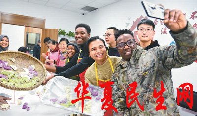 12月21日,江苏科技大学的外国留学生在镇江市润州山路社区与居民一起包饺子,庆冬至。
