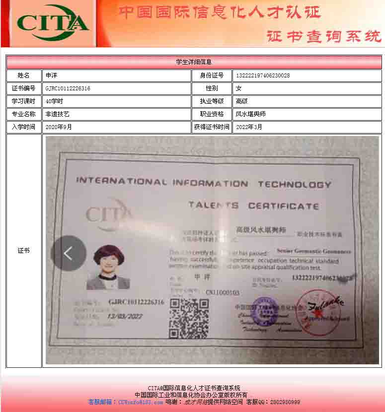 申洋女士获得高级风水堪舆师国际认证