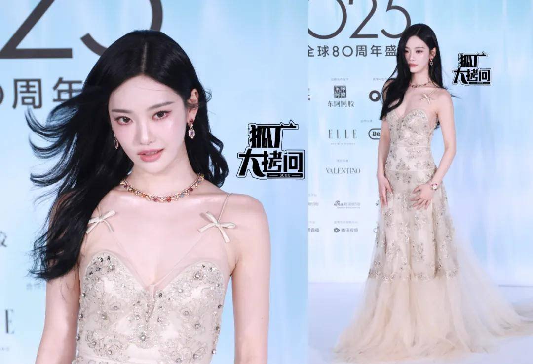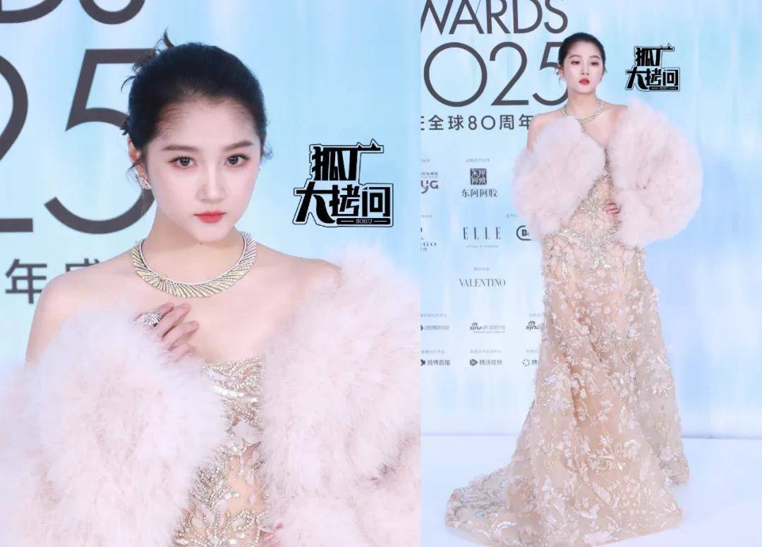 张婧仪的玫瑰金长裙也很优雅,披散的长发和轻薄的妆容平衡了裙子带来的成熟感,所以整体不会有借了姐姐衣服来穿的错觉。