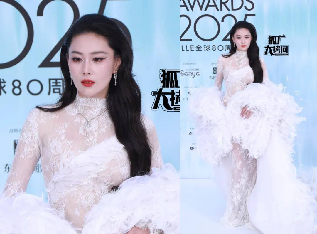 张馨予穿了一条白纱长裙,裙摆很华丽,搭配红唇浓妆,有点像民国剧里上海滩第一交际花,美艳十足,是如今小花中稀缺的类型。