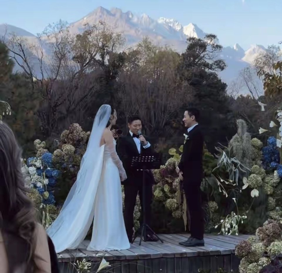 昨天,霍启仁与南风在玉龙雪山脚下举行婚礼,只邀请了最亲近的家人朋友参加。这里的海拔大约3100米,亲友们一边吃席,一边吸氧。