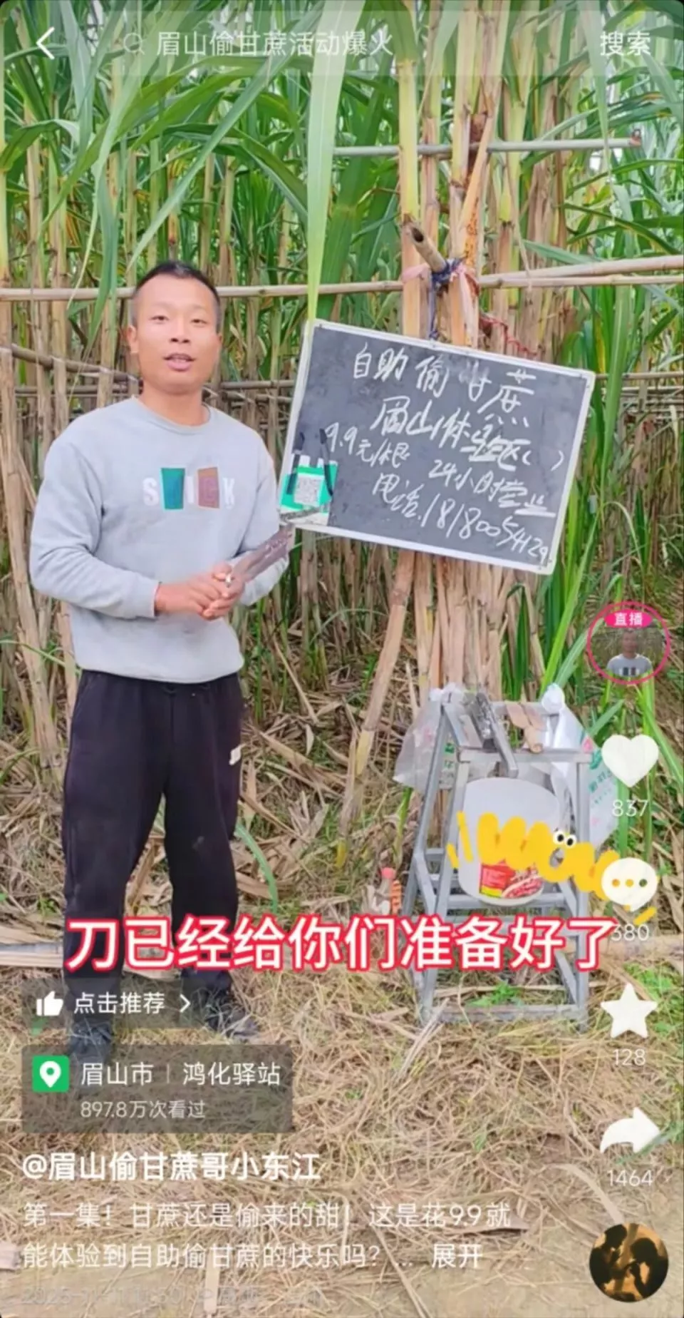 本月初,四川眉山一位 29 岁的甘蔗地老板(以下简称“甘蔗哥”),因为偶然在网上刷到网友 “ 偷甘蔗 ” 的视频来了灵感。