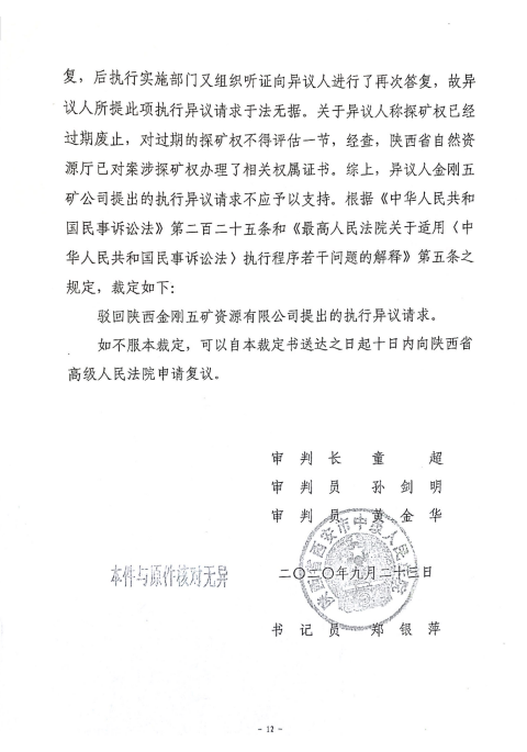 据了解,金刚五矿公司虽然进入了破产程序,但西安中院已在先于2019年9月挂网拍卖金刚五矿公司名下的两宗探矿权,因无人竞买而流拍,该院遂于2019年9月29日作出“以物抵债”裁定,将上述探矿权作价2221万元抵偿给小贷公司,执行案件执行完毕。