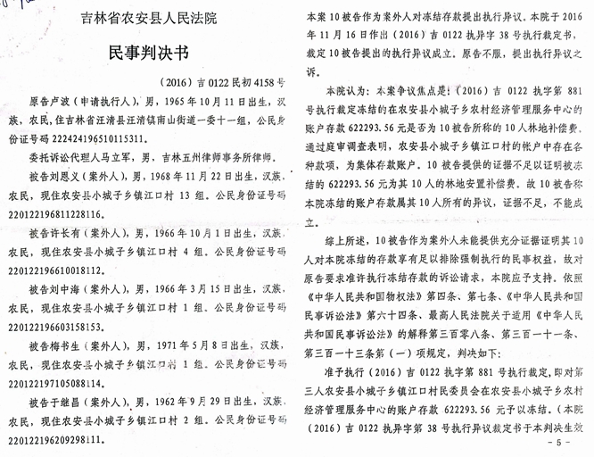对此裁定,卢波提起执行异议之诉后,农安县法院又于2017年1月20日做出(2016)吉0122民初4158号执行裁定书称:本院认为:本案争议焦点是(2016)吉0122执字第881号执行裁定冻结的在农安县小城子乡农村经济管理服务中心的账户存款622293.56元是否为10被告所称的10人林地补偿费。通过庭审调查表明,农安县小城子乡镇江口村的帐户中存在各种款项,为集体存款账户。10被告提供的证据不足以证明被冻结的622293.56元为其10人的林地安置补偿费,故10被告称本院冻结的账户存款属其10人所有的异议,证据不足,不能成立。