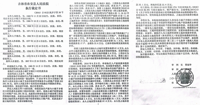 对此,刘恩义、许长有、于继昌、刘中海、梅书生、佟希彬、李兆义、王有财、付存政、石显臣等十位农民提出异议,认为此款是林地补偿款,专款占用,不应被乡村用来还钱。农安县法院经审理,做出的(2016)吉0122执异字第38号执行裁定书称:本院认为,本院冻结的被执行人农安县小城子乡镇江口村民委员会在农安县小城子乡经济管理服务中心帐户的款确系吉林省松花江干流治理工程管理局给予的征用林地补偿款。根据国家有关政策规定,土地补偿款补给土地所有者;安置补助费补给土地使用者。本案中,被执行人为土地所有者即土地补偿款享有者;异议人为部分土地使用者(林木所有人)即安置补助费的享有者。据此,异议人对安置补助费的异议主张本院应予以保护,故依照《中华人民共和国民事诉讼法》第二百二十七条和《最高人民法院关于适用<中华人民共和国民事诉讼法>执行程序若干问题的解释》第十五条的规定,裁定如下:异议人刘恩义、许长有、于继昌、刘中海、梅书生、佟希彬、李兆义、王有财、付存政、石显臣对安置补偿款的异议主张成立。